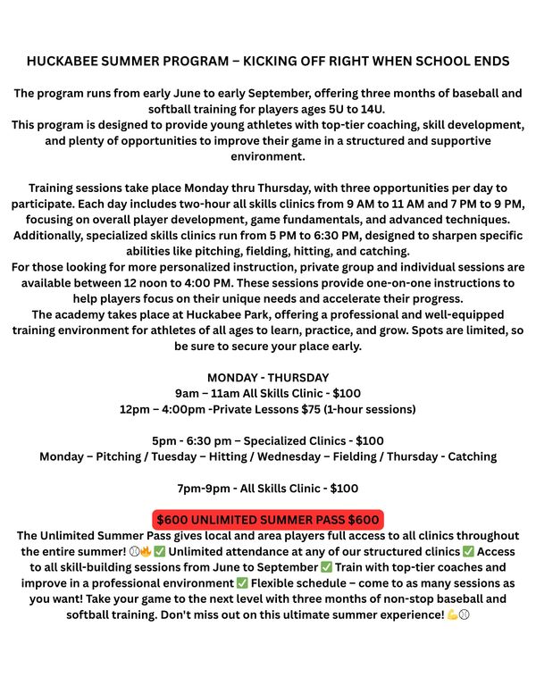 Unlimited Summer Pass – Baseball Academy The Unlimited Summer Pass gives players full access to all Baseball Academy clinics throughout the entire summer! ⚾🔥 ✅ Unlimited attendance at any of our structured clinics ✅ Access to all skill-building sessions from June to August ✅ Train with top-tier coaches and improve in a professional environment ✅ Flexible schedule – come to as many sessions as you want! Take your game to the next level with three months of non-stop baseball training. Don't miss out on this ultimate summer experience! 💪⚾